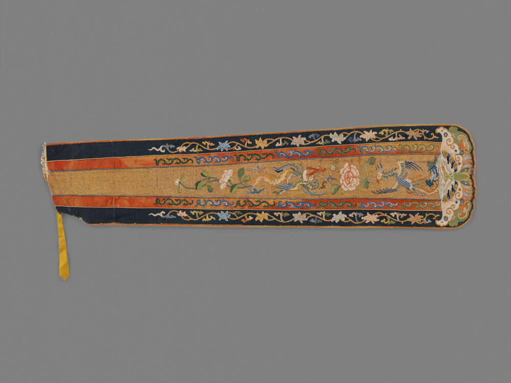 DescriptionGold panel that hangs in the front opening of the lady's coat. Gold central panel decorated with flowers and phoenixes, bordered with a floral pattern on a black background.ProvenanceNellie B. Hussey, Peiping (modern-day Beijing), China, possibly by November 5, 1931-1937 [1];