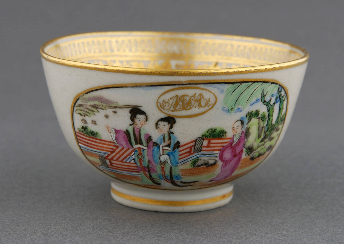 DescriptionPart of 77 piece tea service. In bottom of saucer, on exterior sides of cups is a scene painted in famille-rose style stowing 2 Chinese ladies and attendant in garden. Above figures is gold monogram, MTA (?) in gold oval. On interior sides of all pieces is border design in gold of grape bunches and leaves. On handleless cup on exterior side is also a gold spray of leaves and berries.