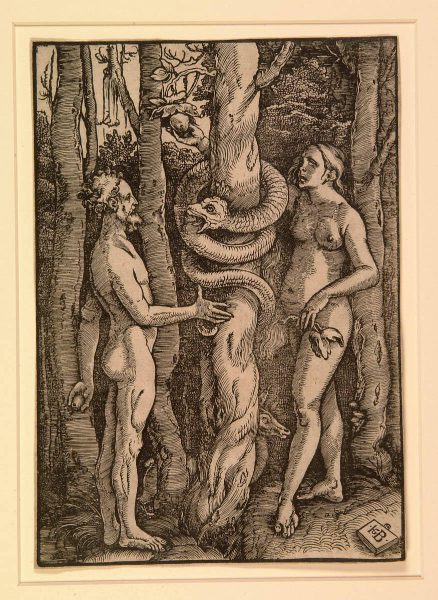 Gallery LabelHans Baldung Grien’s representation of humanity’s loss of innocence is loosely based on Dürer’s woodcut of the same subject. He models his deceptive serpent on Dürer’s crested creature and relies on a dense tree line to propel his figures to the foreground. Instead of portraying the figures in a tight embrace, indicating equal responsibility, Baldung Grien separates the two figures. Eve turns slightly toward the viewer, actively reaching out to grasp the apple, while Adam stands passively to the side.