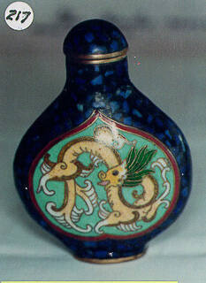 DescriptionPolychrome bottle, each side decorated with a stylized dragon amid lapis lazuli enameled reserves; matching stopper.
