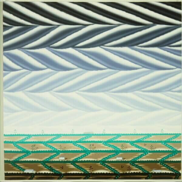 DescriptionIn the top 2/3 of the canvas are 6 horizontal layers of stylized, diagonally angled clouds. are grey and white; the top layer is fairly dark, and each layer gradually becomes lighter. the canvas are 4-1/2 horizontal layers of diagonally angled, brown parcels of land. divided off by lines or green trees. The trees in the top layer are fairly light, gradually becoming dark at the bottom of the canvas. among the trees and parcels are 7 little people, 2 billboards, 2 wire fences, some other trees, and 3 large tGallery LabelSouthern Skies and Southern Pines depicts a highway scene that Roger Brown probably observed during road trips at the time the work was painted. The landscape, sky, trucks, billboards and human figures are so simplified and systematically organized that they become patterns. The main organizing pattern, a zigzag that continues from lines of shrubbery through cloud formations, is interrupted by Brown's use of atmospheric perspective at the horizon line. Here, colors are muted to give the illusion of distance. Brown's manipulation of light is seen in the shadows cast by the figures in the painting. While some are directed toward the right edge of the painting, others fall toward the left, defying natural laws of illumination from a single light source.