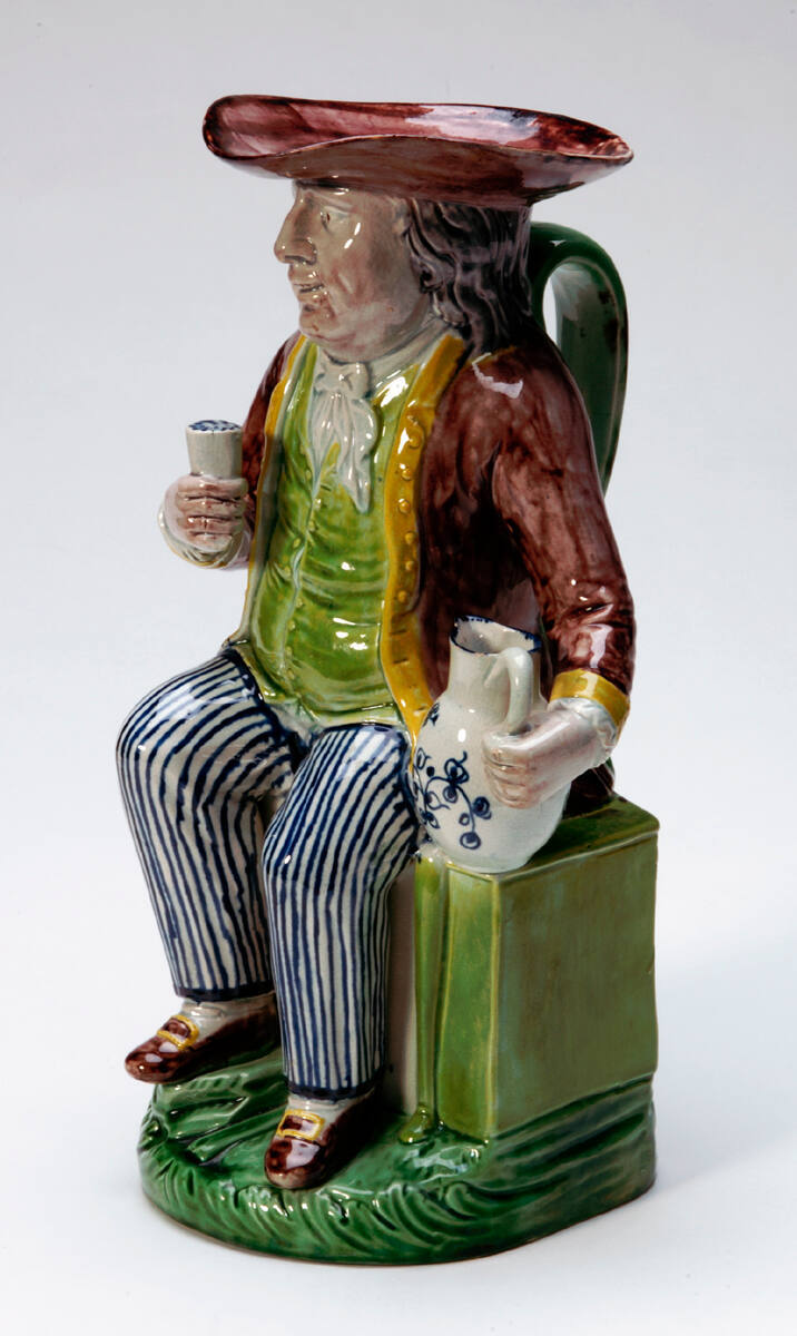 DescriptionPlanter or sailor seated on a chest, holding a beaker in one hand, a blue and white jug in the other. He wears a brown tortoise-shell hat, coat and choes; green waistcoat; and blue and shite striped trousers. Green rustic base.