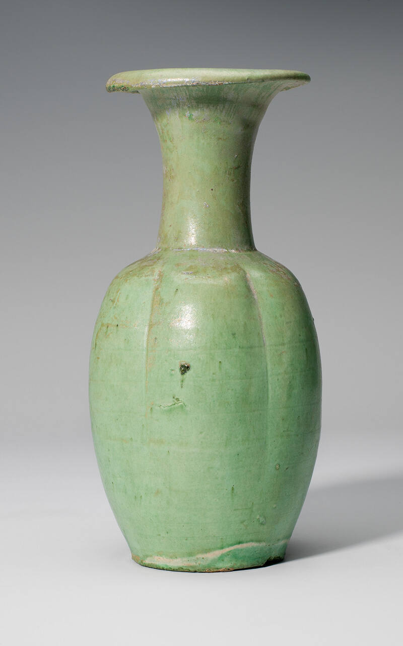 DescriptionVase of porcelainous stoneware. Melon-shaped body with narrow neck and flaring lip. Green glaze which has taken on a silvery iridescence.