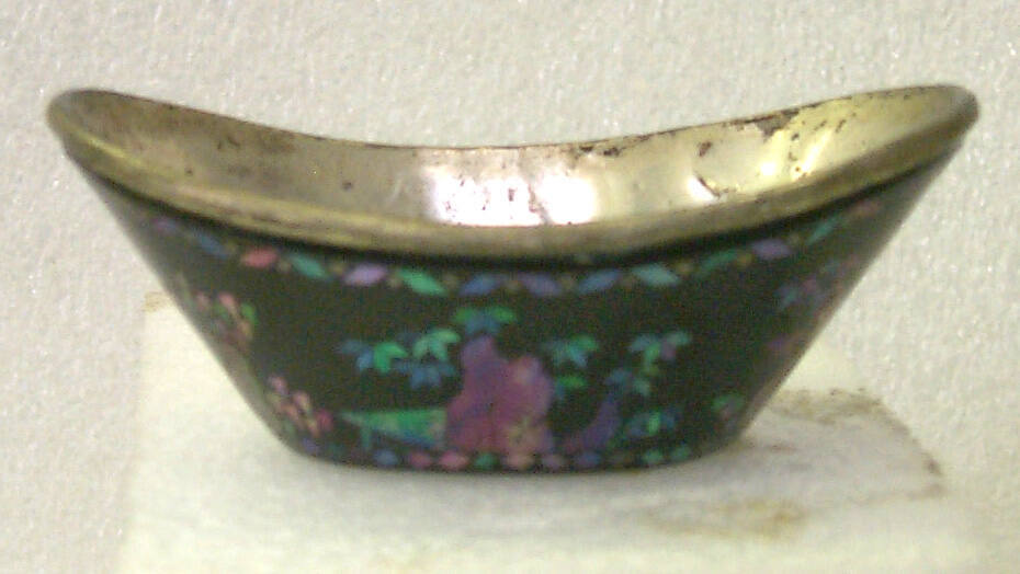 DescriptionThe set of eight wine cups are in the shape of a Chinese gold or silver ingot, but of different sizes ranging from 5.5 cm. to 12 cm. in length. The size increases at a regular rate so that each cup, when piled up, may nestle comfortably in the next one. These black lacquered cups are silver inside, while the outer surfaces are decorated with Chinese garden scenes in mother-of-pearl inlay. The landscape on each cup has a band of geometric pattern along its top and bottom borders. The iridescent figures, rocks, pavilions, willows and wu-t'ung trees on the larger cups gradually dwindle to mere geometric leaves against a black background on the smallest one.
