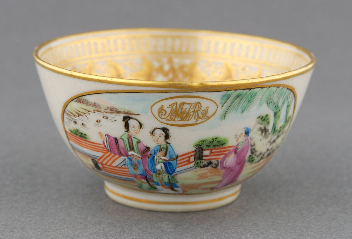 DescriptionPart of seventy-seven piece tea and coffee service. In bottom of saucer and on interior sides of cups is a scene painted in Famille rose style showing two Chinese ladies and attendent in garden. Above figs is gold monogram, MTA, in gold oval. On interior sides of all pieces is border design in gold of grape bunches and leaves. On handleless cups on exterior side is also a gold spray of leaves and berries.