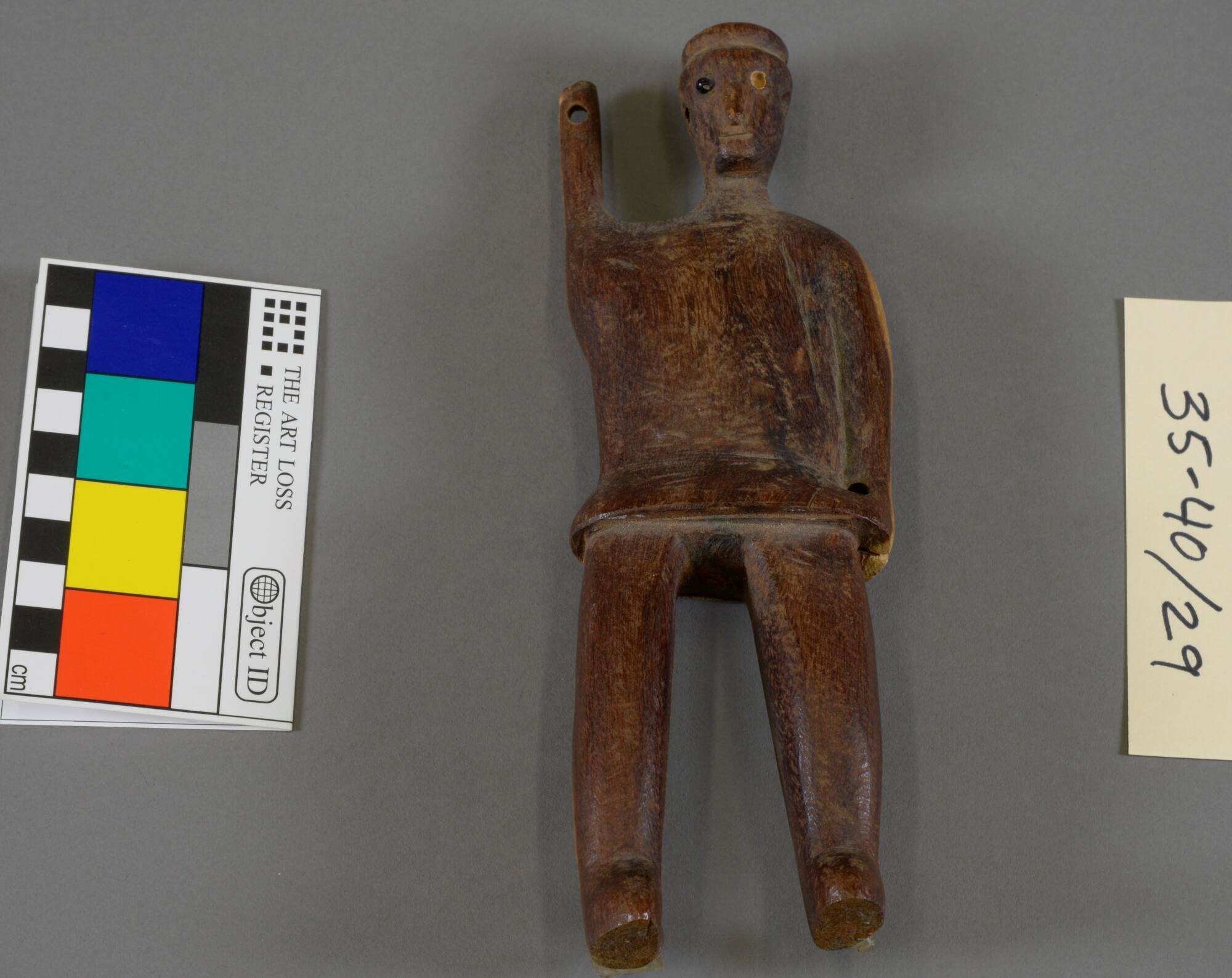 DescriptionCarved wooden figure of man holding right arm up. left arm down at side carrying a mallet, red bead eyes. From Capetown.ProvenancePearle Scales Moore (1867-1934), Peoria, IL, by 1934 [1];