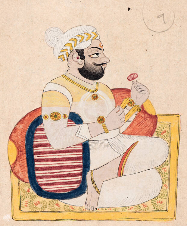 DescriptionPainting mouned on a second sheet with sequentially numbered rows of figures. Inscription added later. Jewelled and turbaned Maharaja seated cross-legged on rug, facing to right, holding red flower. Inscription and numbers on back.