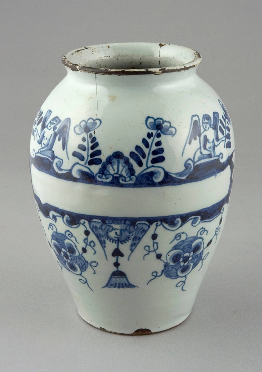DescriptionWide-mouthed jar with blue decoration on white ground. Horizontal escutcheon bordered by flowers, vines and garlands. Two winged figures on top; sun-like face appears from bottom edge, center of escutcheon, tassel hanging from his mouth. Rimmed circular lid and circular wood stand. (Two cracks running from rim into shoulder; surface ship bottom edge center front).