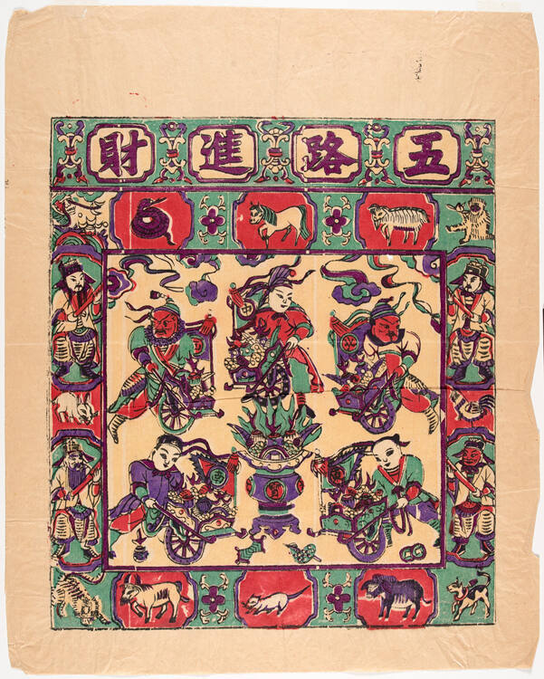 Gallery LabelWealth Coming from Five Directions offers the wish for good fortune coming from every direction. The 12 animals in the borders of both prints are Chinese Zodiac animals, each representing the sign of a lunar year, which bring blessings for peace. Also in the borders are several messengers who announce the news of the coming new season and year. Prints with dense patterns like these may also be used for decoration or for wrapping gifts.