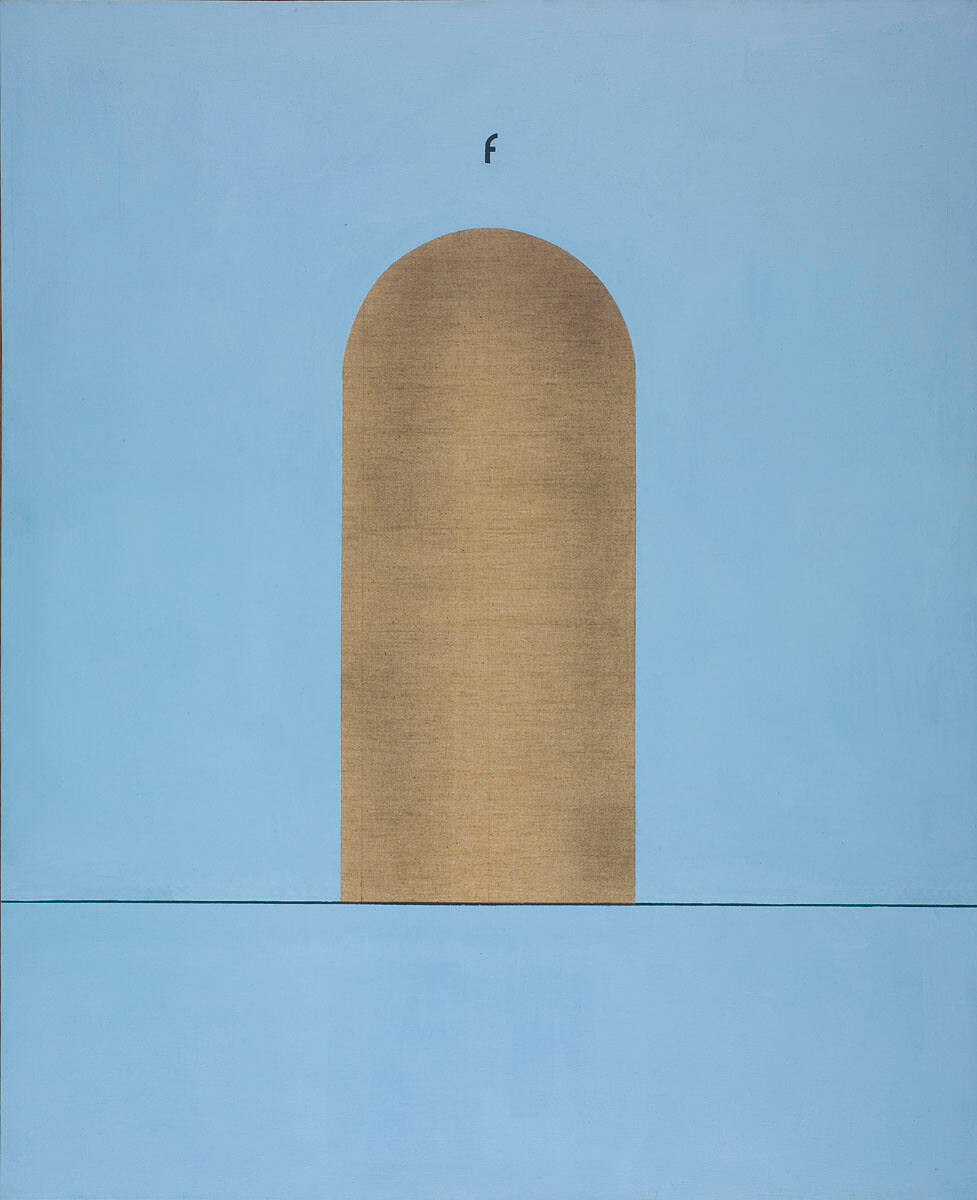 DescriptionA large silo shaped form, mottled brown in color, placed on a horizon line on a field of blue. lower case "f."
