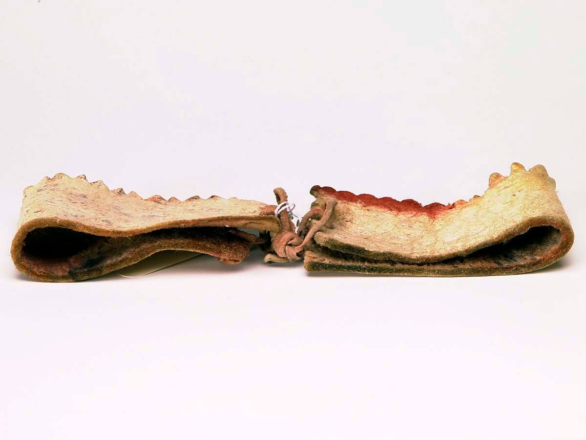 DescriptionRound pieces of leather with a zig-zag pattern along one of the long sides with the other three sides being cut cleanly. Two holes are punches in each of the short sides so that the wristlet can be tied together with rawhide laces. The wristlets are white in color with some traces of red pigment on one end.