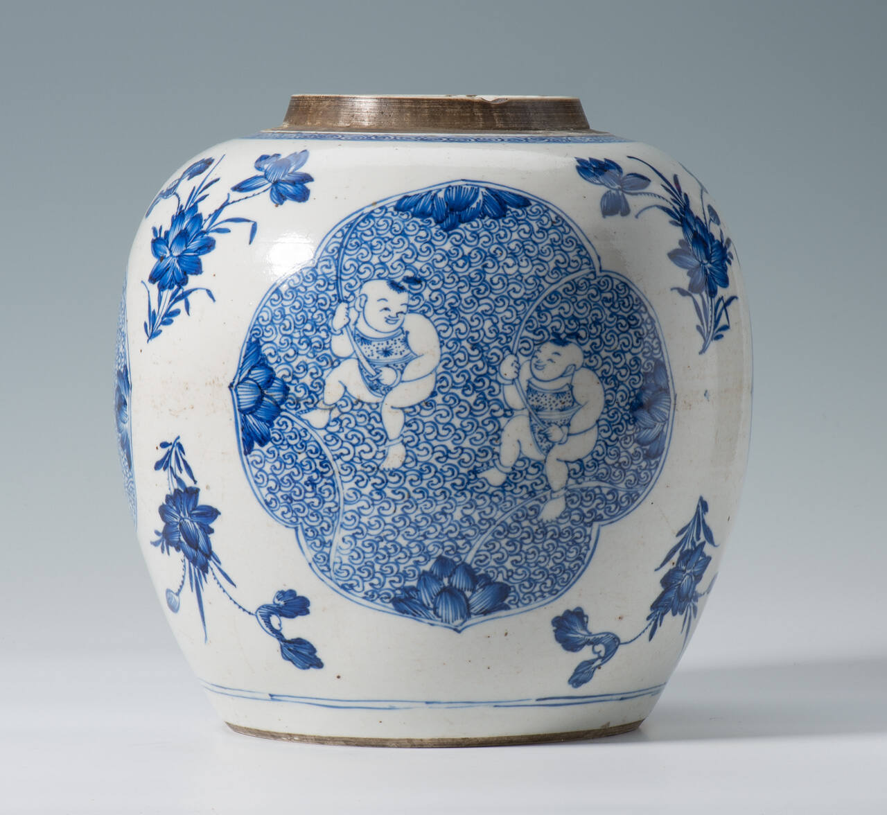 DescriptionBlue and white porcelain ginger jar in oviform shape. Decorated with sprays of lotus blossoms and leaves in blue on white. Two quatrefoil reserves on either side with two figures in each. Teakwood cover.