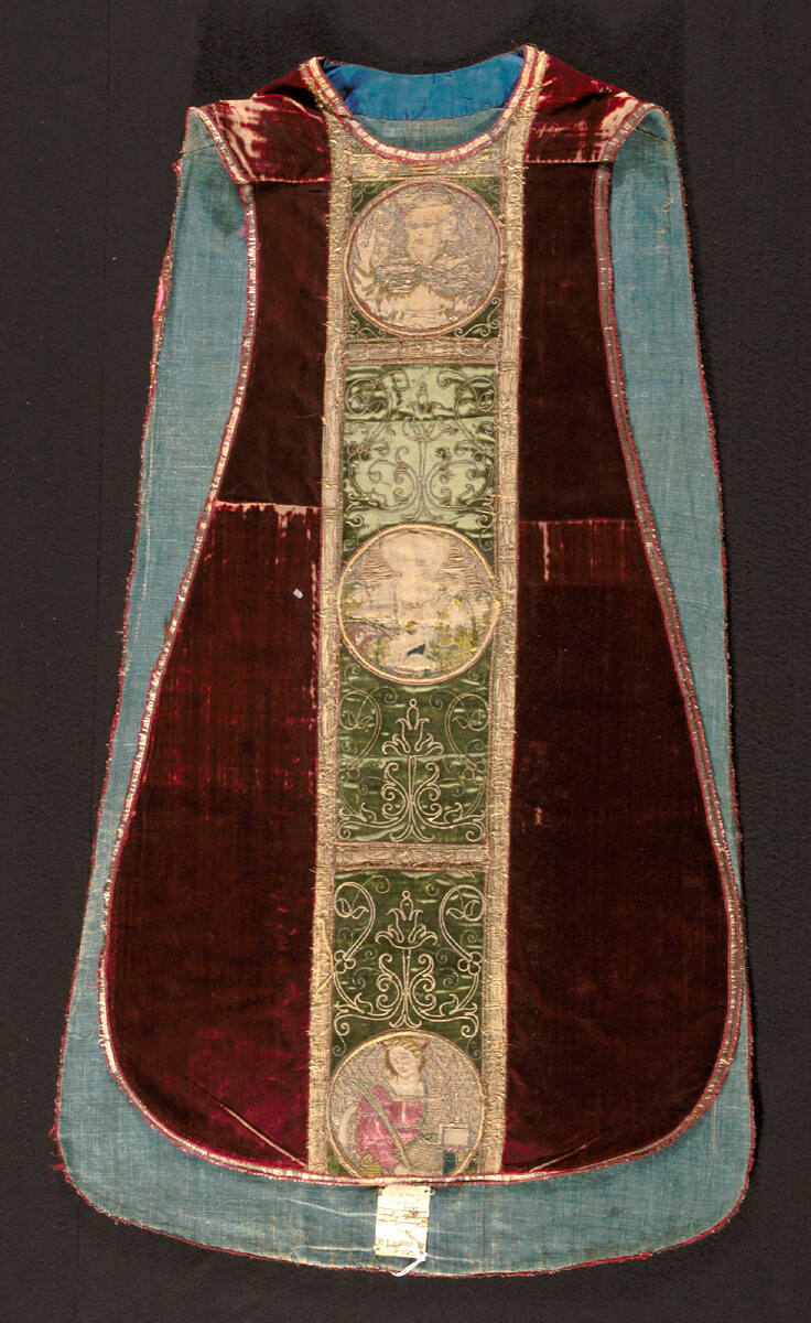 DescriptionMain ground: solid, red silk cut velvet. Orphreys: solid, green silk cut velvet with applied roundels of linen embroidered with polychrome silks and poor quality metal thread in long-and-short, split and straight stitches and couched work. The velvet is ornamented with couched silver cord. The roundels were outlined with red silk and gold cord (work to the linen cave) and the orphreys were bordered with bands of metal thread couched over linen threads. The edges of the chasuble are trimmed with a later silk and metal braid. It is lined with blue linen.ProvenanceWith Wm. Baumgarten & Co., New York [1];
