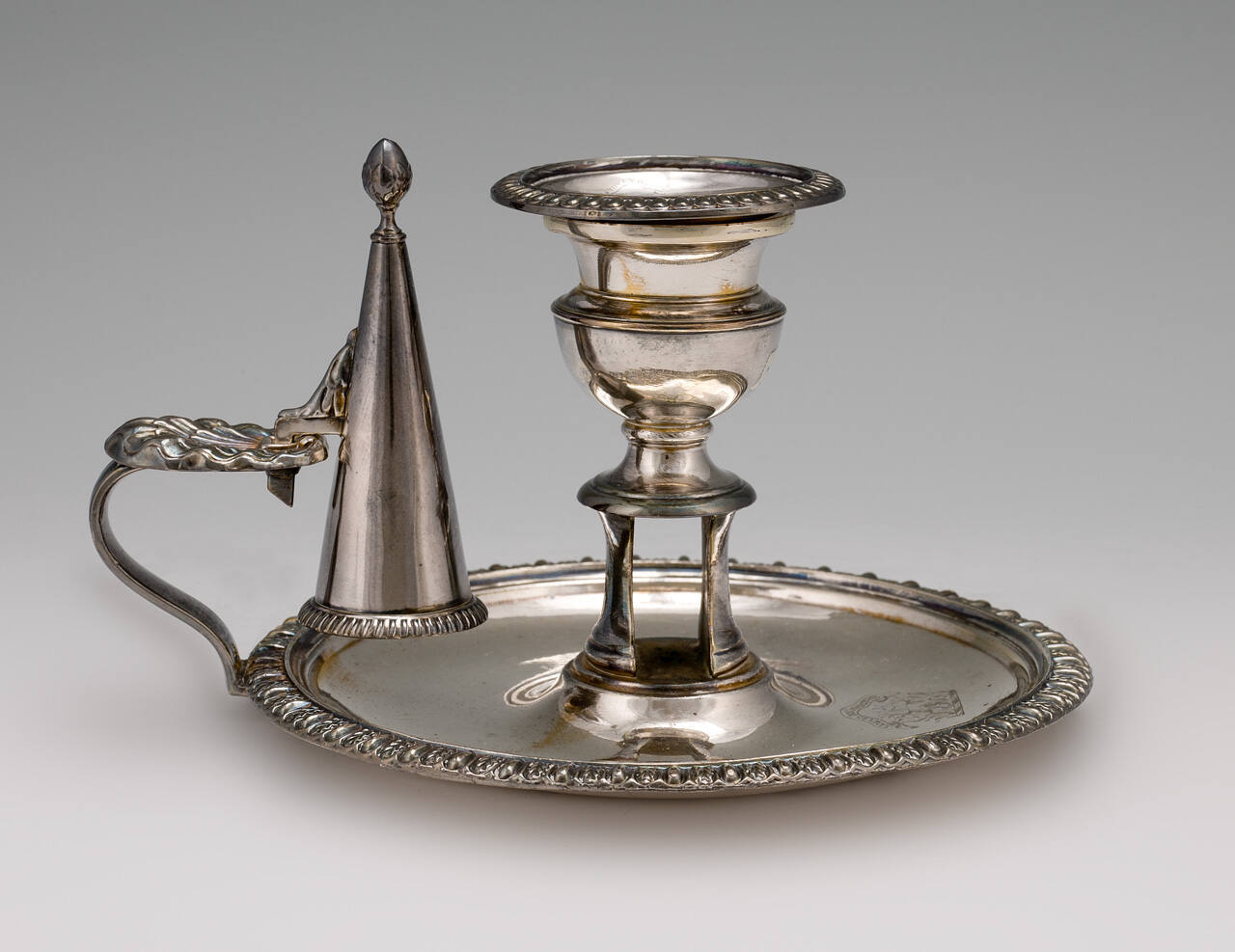 DescriptionUrn-shaped socket with gadroon rim on slotted stem fitted to circular tray with gadroon border and handle; conical- shaped extinguisher with acron finial; crest engraved on tray. Marks on bottom: two suns.