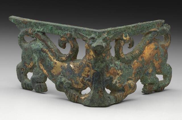 DescriptionTable leg or bracket with a motif of two lions meeting in the corner, with a common head. Red gilding and green patina.ProvenanceWith Dr. Otto Burchard, Peiping (modern-day Beijing), China, by 1932 [1];