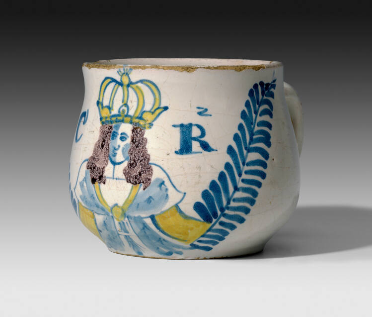 DescriptionGlobular body, flat base, loop handle. Full-face, bust portrait of King Charles II on one side, flanked by the initials CR2 within a blue wreath.Gallery LabelImages of King Charles II, such as the example on this cup, often appear on pottery produced between 1660-1685. Not necessarily an actual likeness, the images commemorated the restoration of the monarchy.