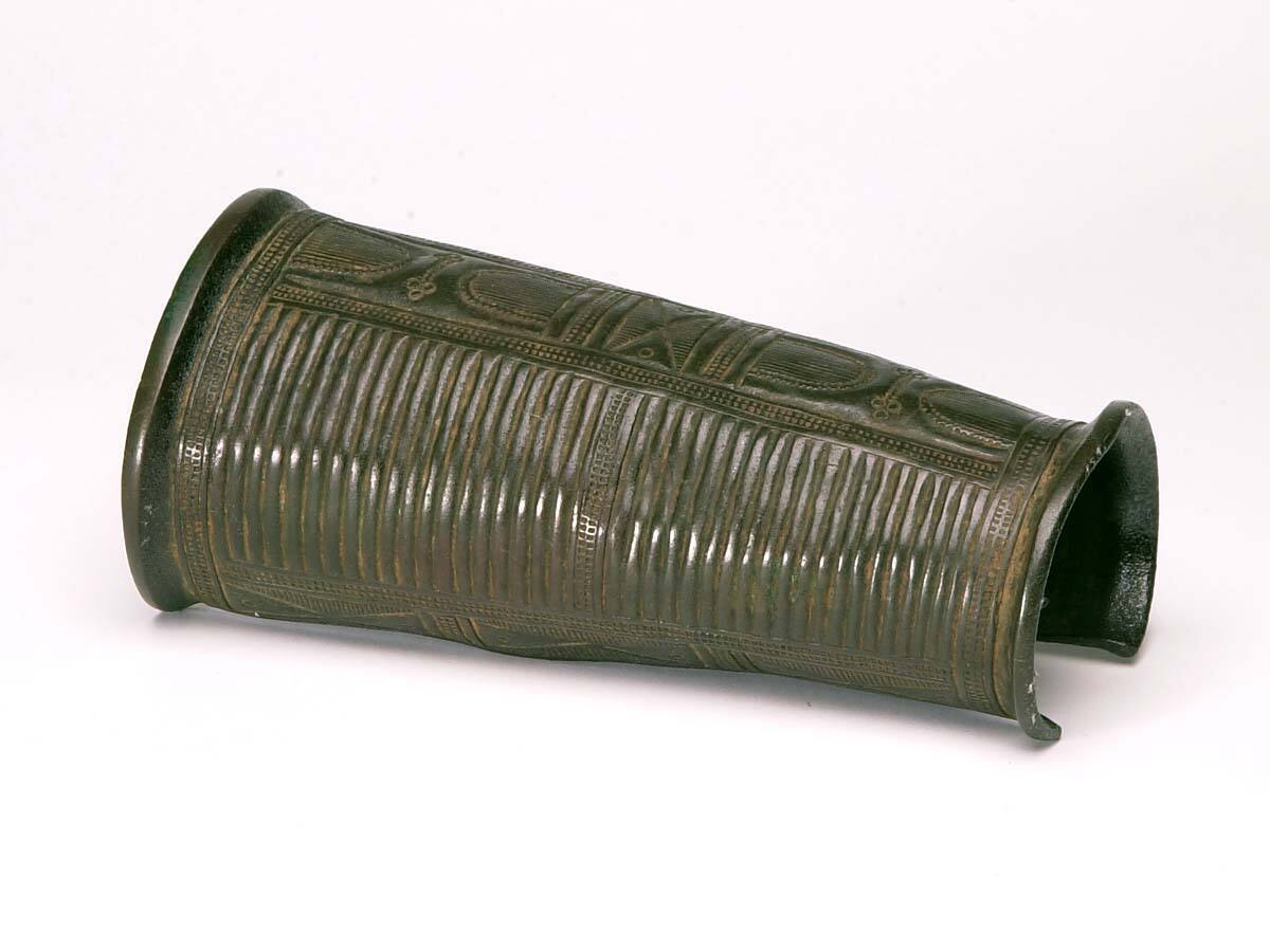 DescriptionLong cylindrical copper alloy bracelet or anklet open along its full length on one side. banded decoration on the outside surface of the object.ProvenanceMelvin Dwork (1922-2016), New York, NY, by 1995;