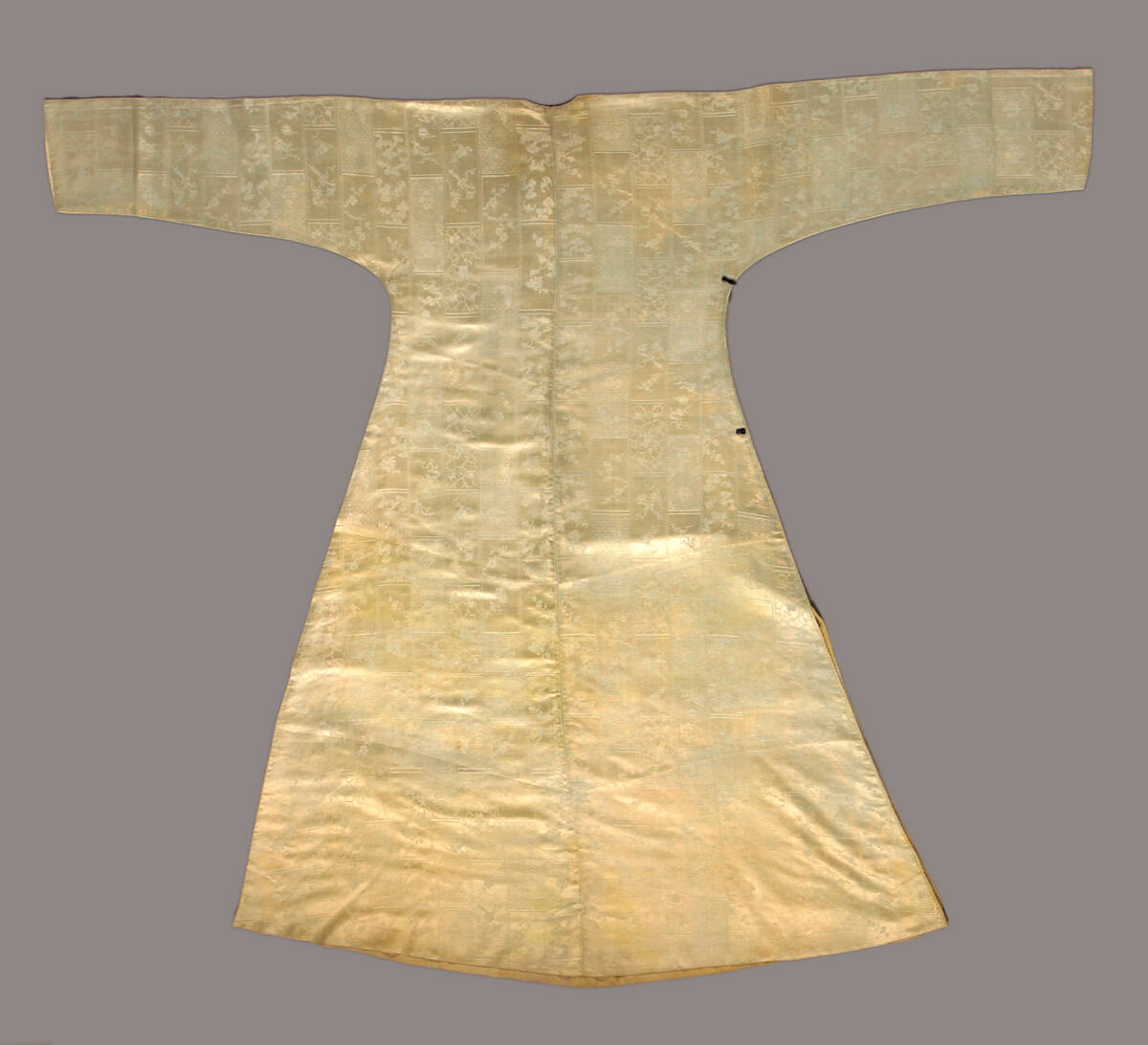 DescriptionLight blue satin with pattern of rectangles containing flower symbols and diaper pattern. Original tan silk lining.
