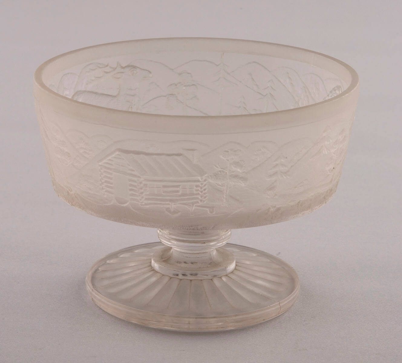 DescriptionDecorated with a pressed design of log cabin, buffalo and reindeer against Rocky Mountain background.