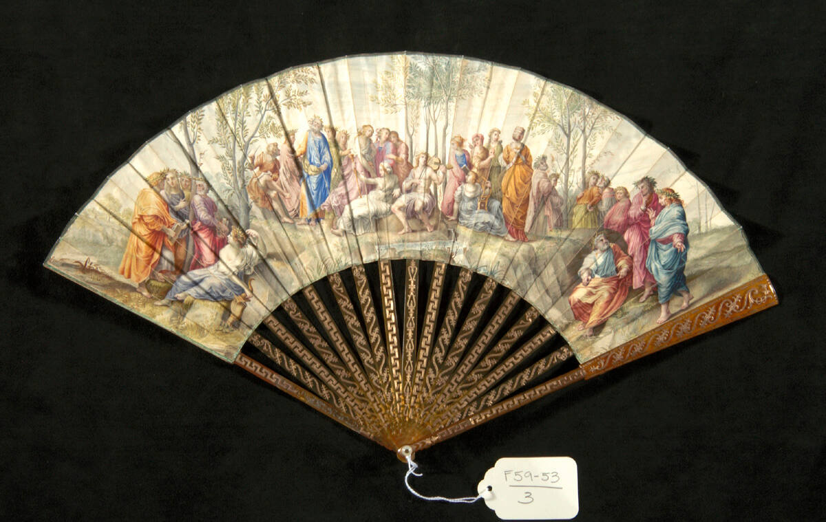 DescriptionA dense people scene with many robed standing and seated figures, most wearing laurels, some bearing musical instruments or books depicted on recto. Additionally, a seated woman at left holds a scroll inscribed "Sappho". On the verso, a faintly painted landscape is depicted with hills surrounding water and a tree. At left in the foreground, is a figure on a hill, with rowboat at top left and a castle at lower left. At center is a ruined colonnade with a fountain at top right. The spines are decorated in gold with Greek-key and foliated scroll patterns.ProvenanceWith J. Duvelleroy, Ltd., London, by 1959;
