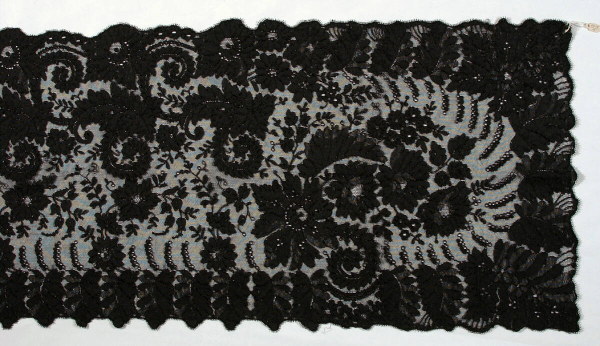 DescriptionMachine lace made on the Pusher lace machine with hand-run outline threads and an added picot edging.