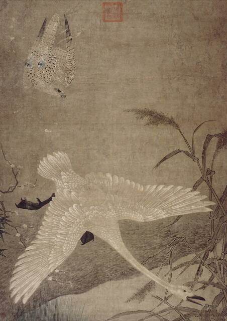 White feathers fly through the air as a swan desperately flees from a fierce hunting falcon, whose leash has just been just released. Chinese people have long associated falcons with warrior power and often depicted them in court paintings. In the Yuan Dynasty, the falcon may have signified a militant aggressor, such as the Mongol people, who conquered the Song Dynasty (960–1279).
