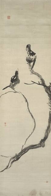 Early Chan (Zen) Buddhist masters, who favored ordinary subjects, often depicted mynah birds because of their subtle appearance. Bada Shanren became a monk when his imperial family fell to the Qing dynasty. Following Chan tradition, Bada captured the essence of the scene with robust brushwork and minimal detail. For instance, the swift strokes above the birds give the painting a slight sense of unease.
