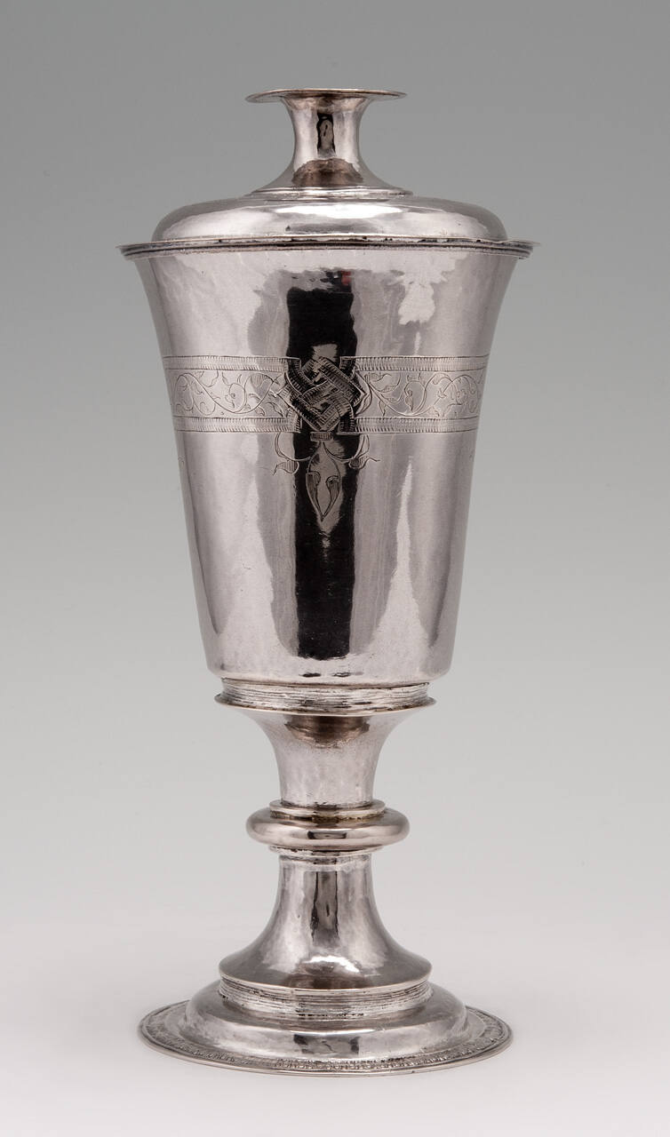 DescriptionCup and paten both hallmarked. Cup in shape of inverted bell or truncated cone. Narrow engraved band of foliage between two narrow fillets encircles upper portion of cup and interlaces. Interior and exterior of paten has similar engraving. Spool-shaped stem with single projecting middle rib.