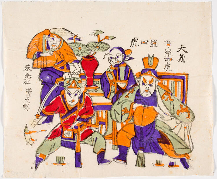 Gallery LabelMartial plays have been very popular in Chinese theater. Both actors and actresses played the fictional characters with equal physical prowess. These prints feature characters in martial poses in theatrical performance. On the right, two heroes rescue a lady abducted by an outlaw named Luo Sihu. On the left print, the hero Qin Qiong defeated an evil foe, who has defeated all the contenders, including a woman warrior on the left.