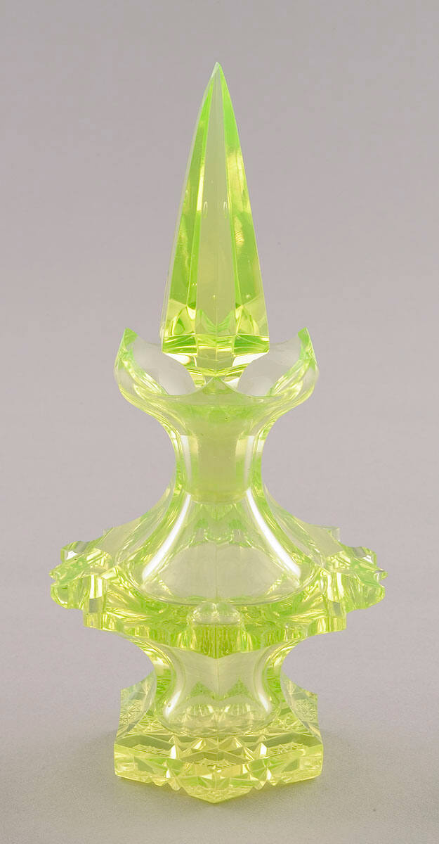 DescriptionBody: two superposed capstan-like forms with six pointed opening at top; bottom is a hexagon circumscribing six hexagrams which circumscribe center hexagram; stopper has hexahedral top.