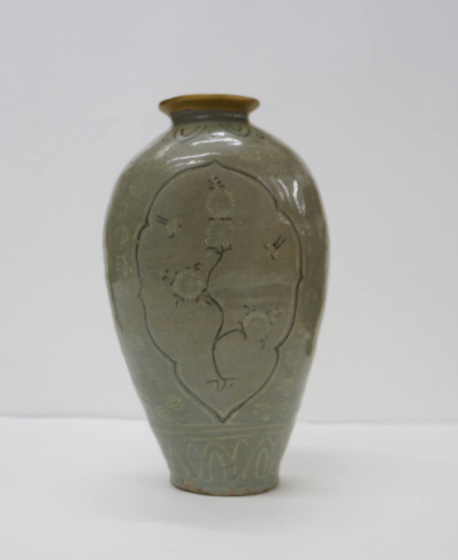 DescriptionFlattened oval bottle with blossoming chrysanthemum and butterfly decoration.