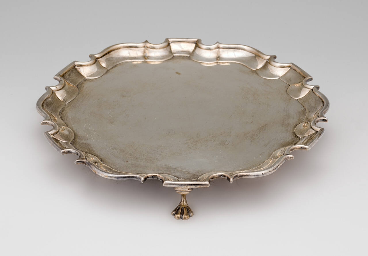 DescriptionCircular silver plate with piecrust edge and three paw feet; no decoration.