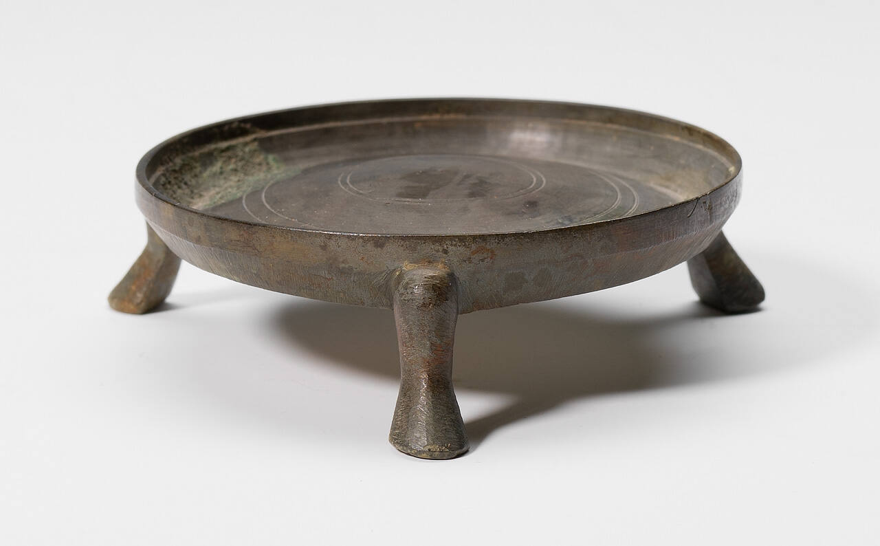 DescriptionA circular tripod stand of shallow form with engraved concentric lines on the interior and chamfered sides raised on three simple cabriole legs. Lathe-turned construction, the metal with lightly encrusted uniform dark gray-green patination.ProvenanceLaurence Sickman (1907-1988), Kansas City, MO, by November 1948-1986 [1];