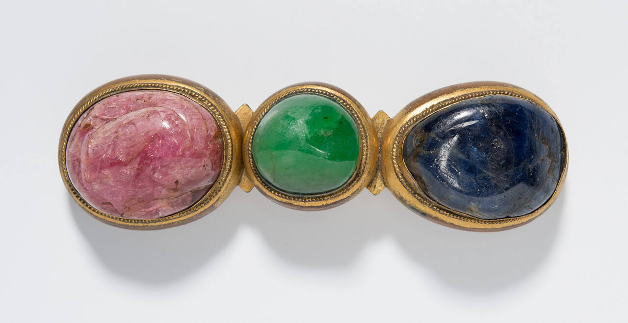 DescriptionGold belt buckle set with rose quartz and lapis lazuli, fastened together with jade.ProvenanceElla Anna Loose (née Clark, 1860-1945), Kansas City, MO, and Washington, DC, by 1934 [1];