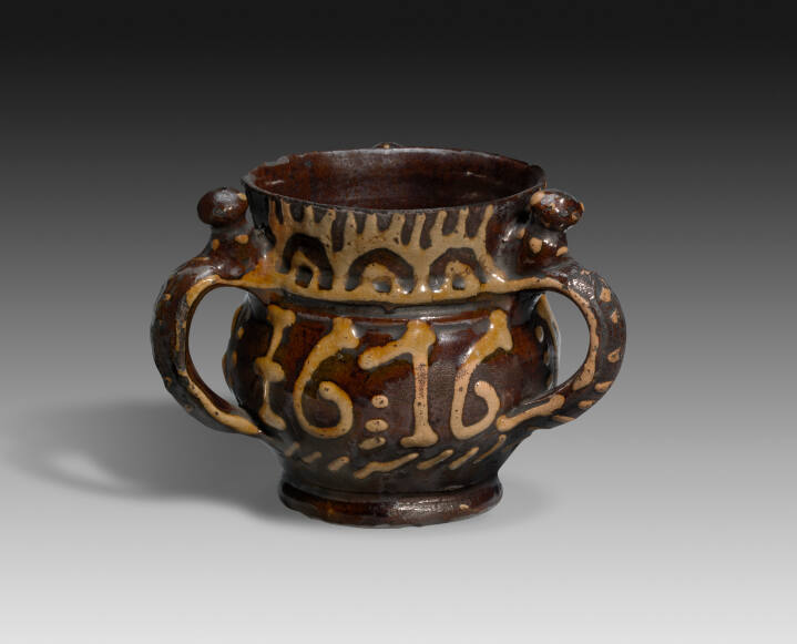 Gallery LabelThis cup's clever construction allows for an alternative, "puzzling" way to drink. There is a hole in each of the knobs on top of the three handles, only one of which is connected to the cup's interior. The skillful drinker must figure out which of the knob's holes can be used as a type of straw, as well as locating an additional hole in the cup's double-walled interior that must be covered to prevent the cup's contents from spilling on the drinker.