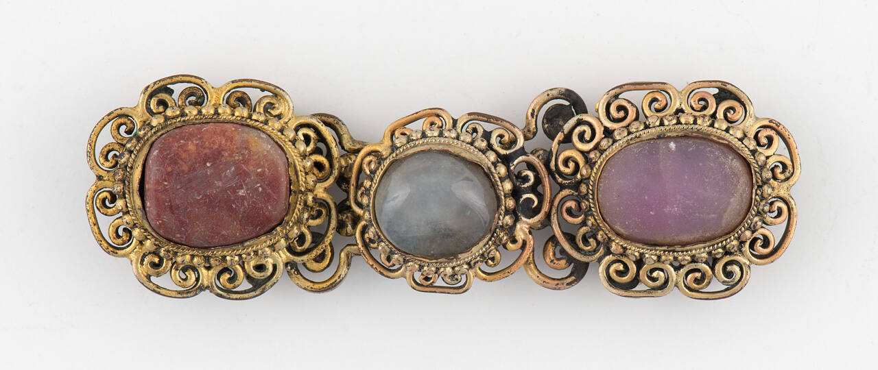 DescriptionGold belt buckle set with agate and lavender glass, fastened together with moonstone.ProvenanceElla Anna Loose (née Clark, 1860-1945), Kansas City, MO, and Washington, DC, by 1934 [1];