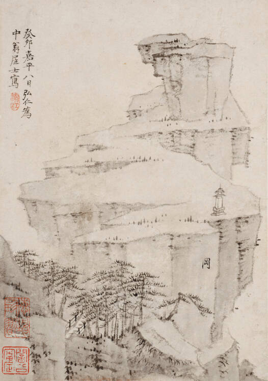 This album of studies represents the full development of Hongren's stylistic repertory just before his unexpected death a few days later. There are no poetic inscriptions, only a single word on each leaf denoting a particular landscape element: cliff, pond, etc. Without sacrificing monumentality or convincing solidity, he has been able to pare his vocabulary to a bare minimum of dry, pale strokes that produce fractured, crystalline rocks and mountains, more insubstantial and more empty, unpainted paper than form modeled of layered ink and texture strokes. Nature seems barren. Pines grow from cliffs at odd angles. Spatial contradictions are deliberately explored and given center stage for artistic effects of ambiguity and visual excitement. The leaf titled Cliff is an extreme example. In all, he presents us with a visionary world - remote and disembodied - yet believable.