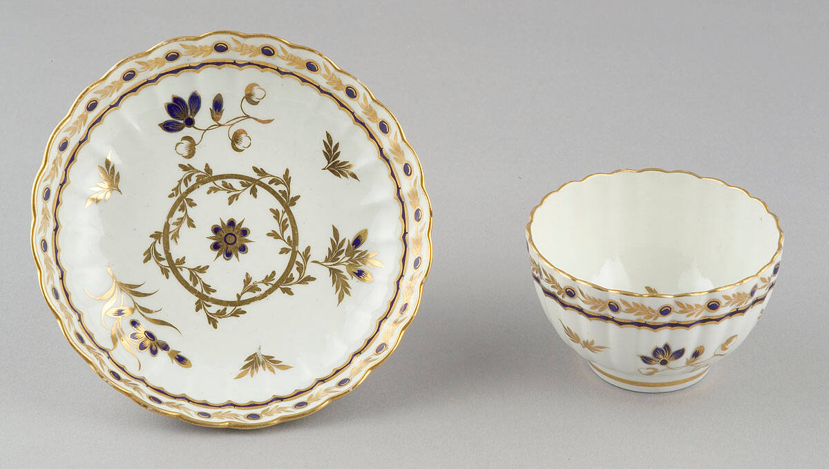 DescriptionCup: without handle; white porcelain with fluted sides decorated with single flower and leaf designs in gold and blue, and continuous leaf pattern around top. Saucer: white porcelain with fluted sides, decorated on inside with single flower and leaf patterns in gold and blue; continuous leaf pattern around edge.ProvenanceMargaret Cameron Chapman (née Mann, 1865-1935), Kansas City, MO, by 1935;