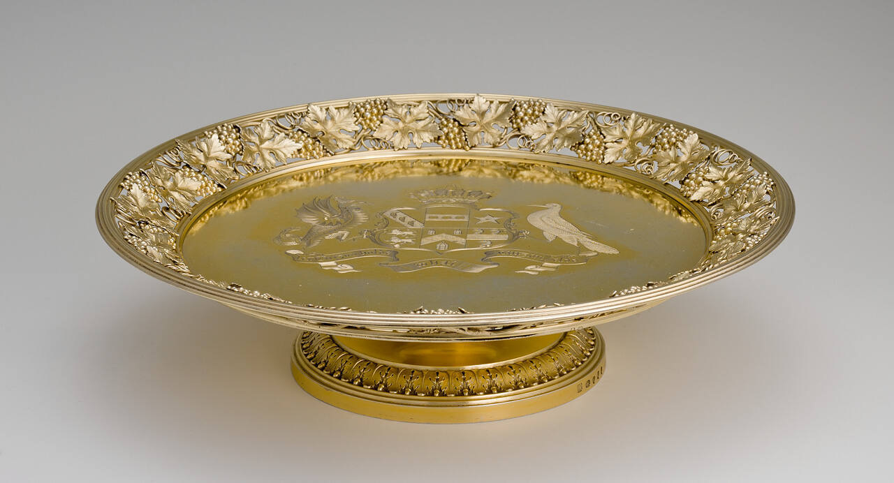 DescriptionCircular plate with fruit and leaf pierced border, on raised foot. The center is engraved with a coat-of-arms. The base and foot are decorated with oak leaves and acorns.Gallery LabelThis footed salver, sometimes called a tazza, is the only completely gilded piece in the Folgers Collection. A creation of the brief partnership of Digby Scott and Benjamin Smith, the salver was commissioned by the Scarsdale family of Derbyshire whose coat of arms is engraved in the center. The detailed grape clusters forming the edge, along with the base's oak leaves and acorns, reflect the revival of classical motifs. The salver was fitting to the Scarsdale family home Kedleston Hall, which was designed by Robert Adam, who promoted the Neoclassical style in England.