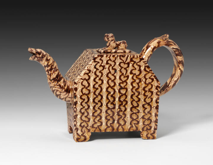 DescriptionOblong shape, bracket feet, loop handle. Animal head forms spout, and the cover is topped by a reclining lion. Cream-yellow body has inserts of brown, vertical stripes in bowed, double lines interwoven with fine brown veins.Gallery LabelClays of different colors were wedged together to create a variegated appearance in imitation of agate, a type of quartz. The glazes were colorless; therefore the decorative effect is derived solely from the colors and patterns of the clay. The agateware body was used almost exclusively for small objects such as tea and coffee wares, however agateware was also used for decorative figures such as the Pug Dog and Hare, whose black and white coats are fashioned from the clays' patterns.