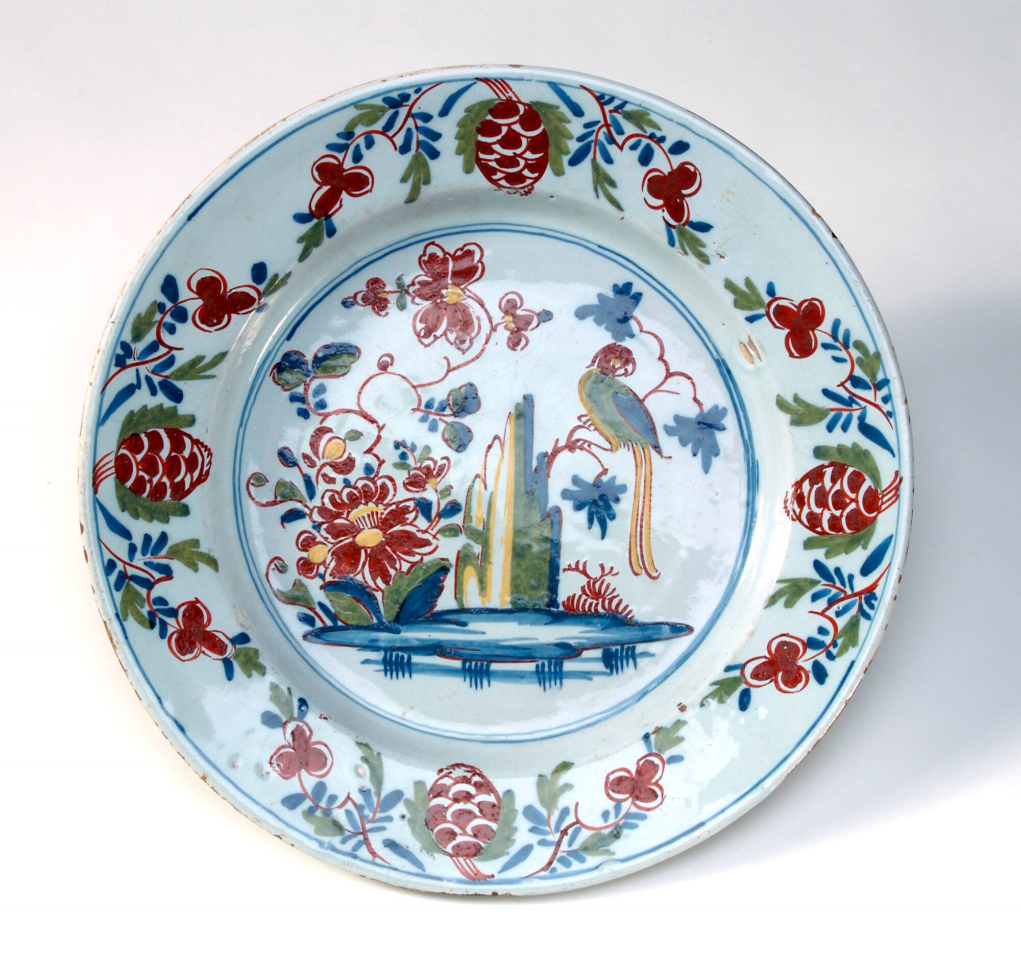 DescriptionBoldly decorated in dark red, green, and blue with, center, a parrot perched on a bough above a root ornament, and, on the rim, with a border of flowers and pineapples.Exhibition HistoryCathay Invoked: Chinoiserie, A Celestial Empire in the West, California Palace of the Legion of Honor, San Francisco, June 11-July 31, 1966, no. 32.
