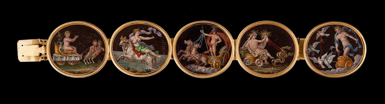 DescriptionGold bracelet consisting of five oval mosaic medallions decorated with various classical subjects and set in gold.Exhibition HistoryOrigins: Collecting to Create the Nelson-Atkins, The Nelson-Atkins Museum of Art, Kansas City, MO, August 14, 2021-March 6, 2022.