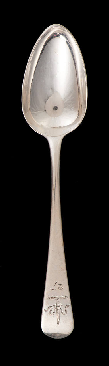 DescriptionOne of a set of 33 silver spoons (from an original set of 70) each individually engraved with a number from 1 to 34 with no. 30 missing. All also engraved with the crest of the City of Chester (snake and sword).