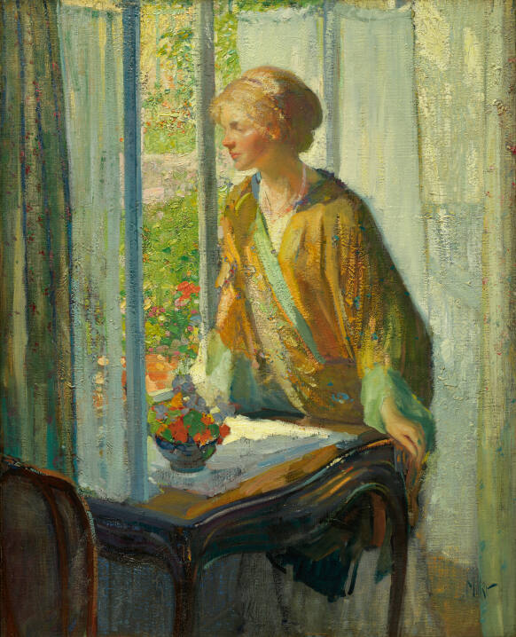 DescriptionA woman in a kimono-like dressing gown stands sideways to an open window and dreamily stares outside to a garden in full bloom. She leans her arms on a small table on which sits a bowl with flowers. A chair can be seen in the lower left corner. White gauze curtains cover the windows but light streams through them, highlighting the woman and tabletop. brightly lit and intense.Gallery LabelRichard Miller's At the Window features the artist's favorite subject-an interior with a solitary, pensive woman brightly illuminated by sparkling daylight from a nearby window. The St. Louis native painted the canvas in Paris, where he spent 15 years beginning in 1899. The painting's vibrant palette, geometrical structure and decorative quality reveal the impact of the artist's French experience. In the first decade of the 20th century, Miller came in contact not only with Impressionism, but also with the more avant-garde artists of the Nabis and Fauve groups, whose loose brushwork and rich, thickly painted surfaces Miller adopted. Even so, Miller's early training in drawing remains visible in the careful, tightly rendered description of the woman's face.