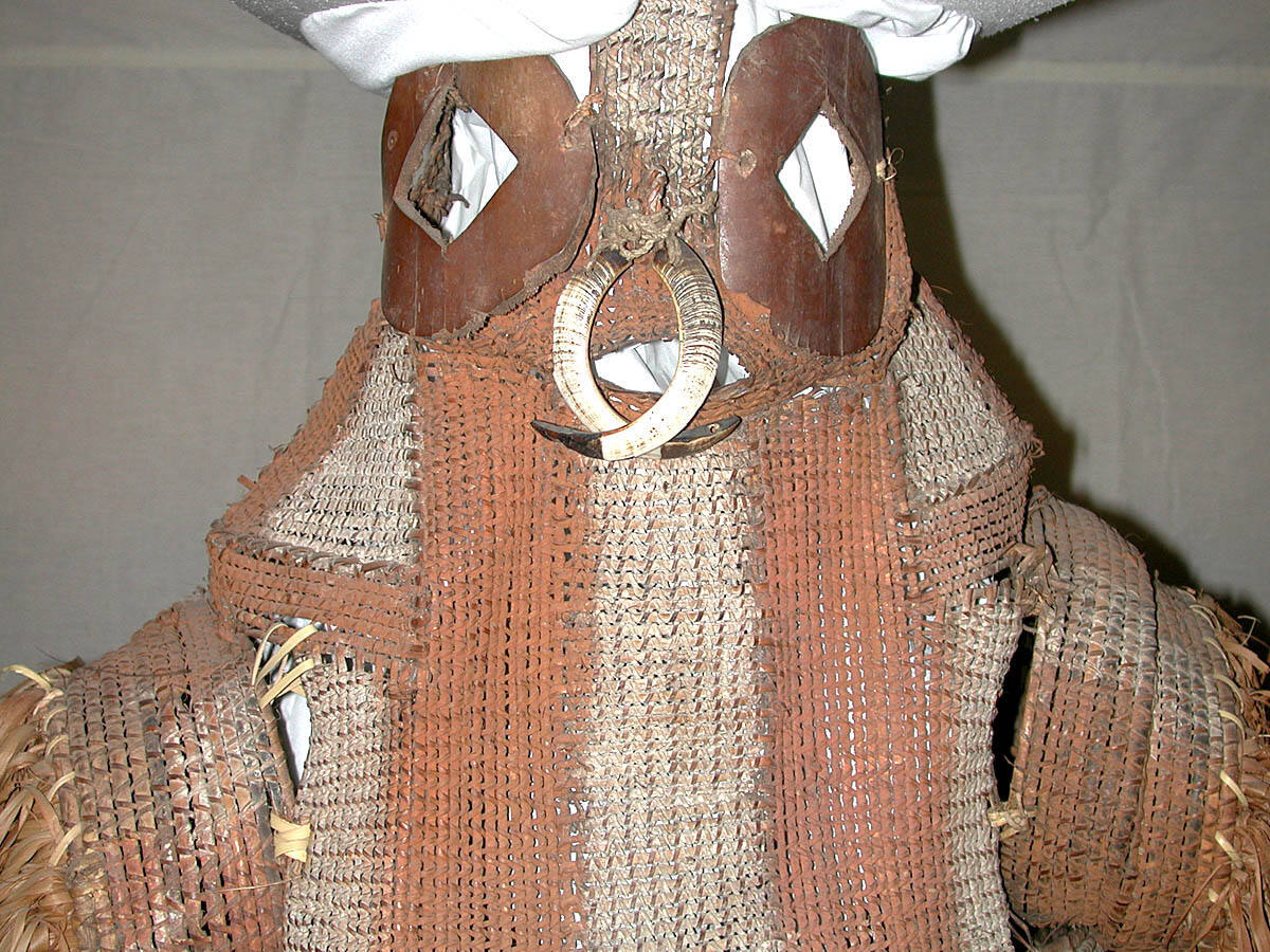 DescriptionCrested helmet mask and bodice with short sleeves, all in one unit. Constructed of woven basketry with long raffia fringe around the edges of the sleeves and bodice. Attached are eyes of bark, circular with diamond-shaped pupils. The nose is pierced with boar's tusks. Painted with red, white, and black earth pigments.