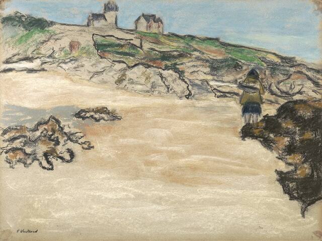 Combing the shores at low tide, the best time for oyster fishing, Vuillard’s fisherwoman wears a creel, a type of wicker basket, over her shoulder for holding her daily catch. Vuillard made this landscape while summering in Saint-Jacut-de-la-Mer, a fishing village in the Brittany region of France. By 1870, the region witnessed the introduction of oyster fishing and farming; the industry has been an economic engine in the area ever since.