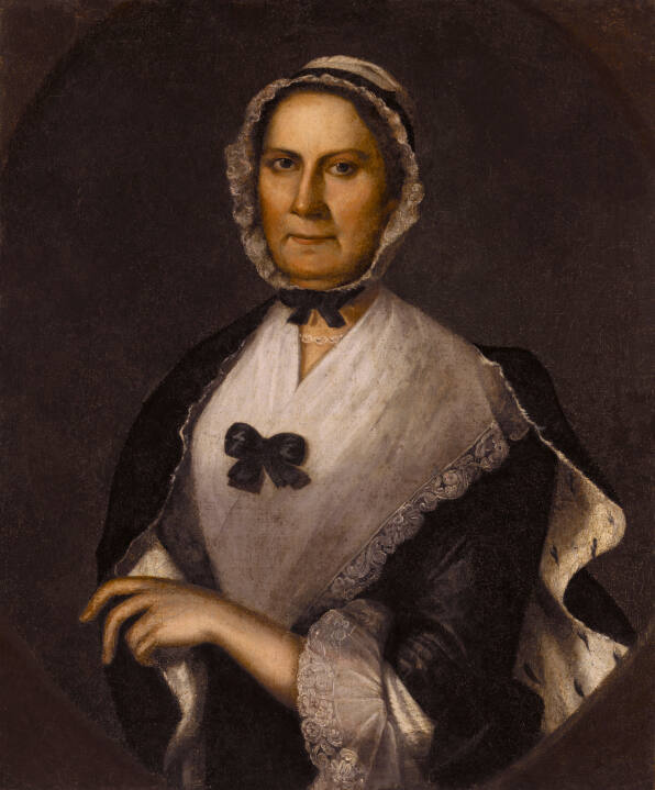 DescriptionHalf-length portrait of a woman, facing one-quarter right, wearing lace-trimmed bonnet with black bow at chin; necklace; black satin dress with lace-trimmed, shoulder-width collar, black bow at bosom; full, lace cuffs; and black cloak lined with ermine about shoulders; left hand on right.Published ReferencesWinifred Shields, “Ancestor Portrait Show Leads to Bizarre Family