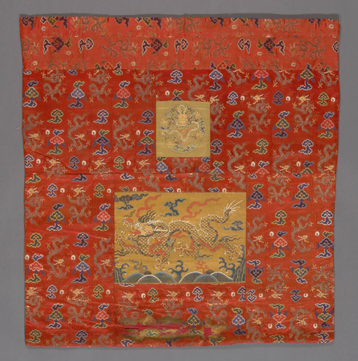DescriptionRed satin ground with gold dragons and blue and green cloud pattern. Two yellow dragons superimposed (has been taken off painting and sewn together).
