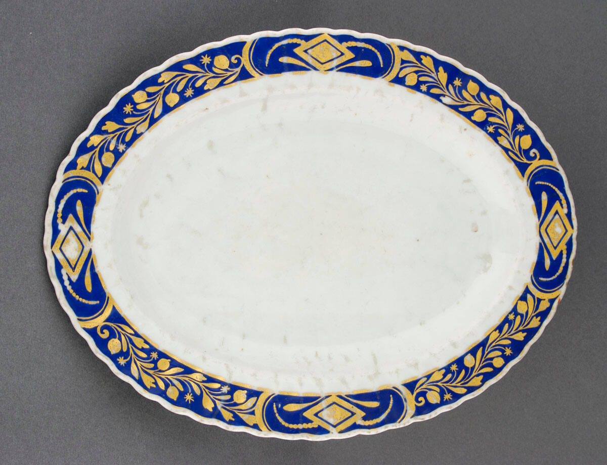 DescriptionWide blue and gold borders, alternating floral and lozenge design.