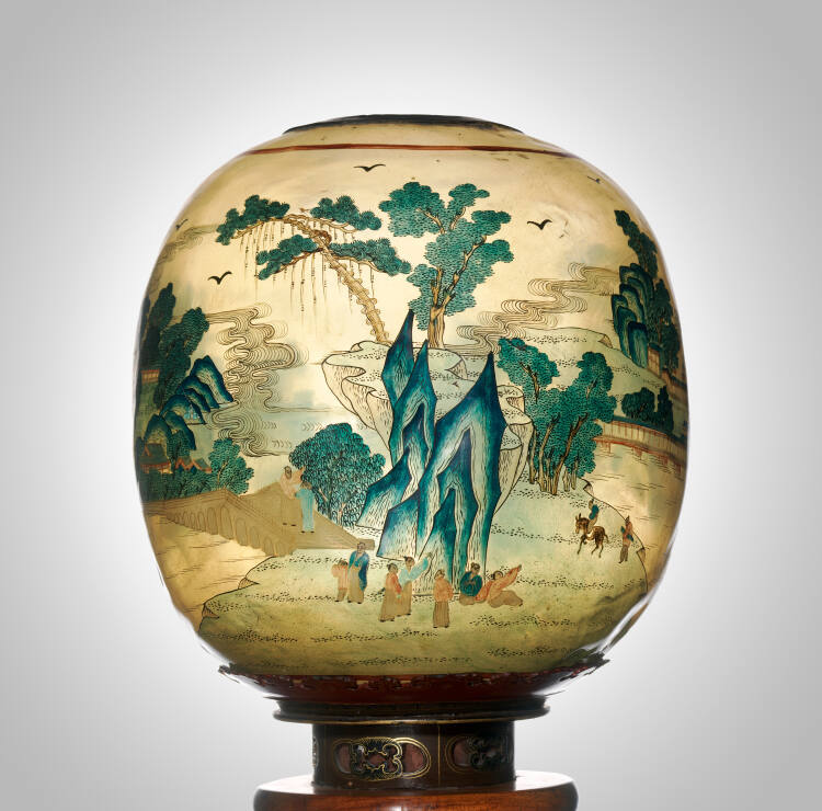 DescriptionA huali circular section post is through (?) tenoned into an X-frame base shaped at the ends to form a low bracket foot with large shaped solid spandrels to each side, tongue and grooved (?) into the feet and post with a smaller set of four spandrels beneath the circular shelf. Together with a pair of spun goat (?) horn spherical lampshade painted with a landscape scene. 20th century, the shades second half of 19th century.Gallery LabelGlass was rarely manufactured in China, so other translucent were used instead for lanterns. These lanterns were made from slices of ox horn that were soaked in warm water and worked together to form a single sheet. The sheets were then hammered thin and shaped into shades and painted on the outside. Imagine how these lanterns would have looked when the candle inside was lit!